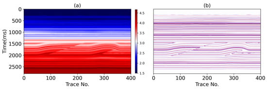 Overthrust model dataset: (a) impedance; (b) synthetic seismic data generated with 30 Hz 0° phase Ricker wavelet.