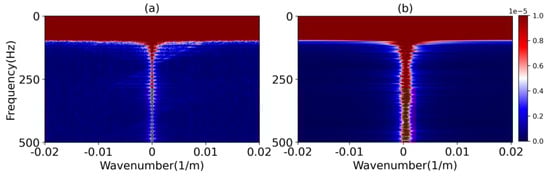 The frequency-wavenumber spectra of the original (a) and interpolated seismic data (b).