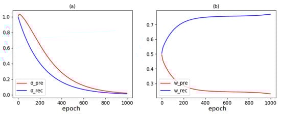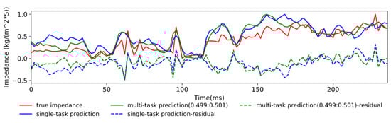 - To maximize the logarithmic likelihood function, that is, to minimize the negative logarithmic likelihood function, then the multi-task loss function is:the process of minimizing the loss function is to learn the optimal weight of and automatically according to the data. As increases, the weight of task impedance prediction decreases. However, with too great an increase in noise, the data will be ignored, so the last term of the objective function is the noise term regularizer. When the loss function reaches its minimum, we can obtain the corresponding and . We use and to denote the weights of the two tasks; then, from Equation (4) we can obtain the optimal weight between the two tasks as: