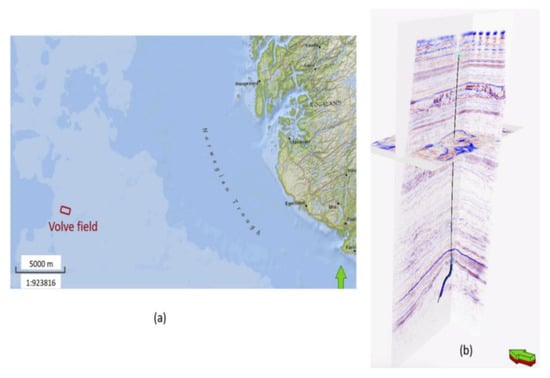 (a) The Volve field, as shown on a map, is located in the offshore North Sea area and (b) seismic data with a well trajectory from the Volve field (figure is from reference [19]).