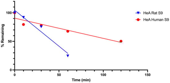 Erinacine A remaining versus time profile in rat and human liver S9. Data is presented in mean values of triplicate measurements.