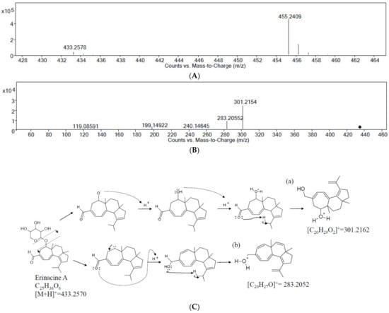 (A) MS spectrum of erinacine A with an ultra-high performance liquid chromatography tandem quadrupole time-of-flight mass spectrometry. (B) MS/MS spectrum of erinacine A with an ultra-high performance liquid chromatography tandem quadrupole time-of-flight mass spectrometry. (C) The proposed structures of product ions, produced by erinacine A, at a collision energy of 10 V. (a) [C20H29O2]+ = 301.2162, (b) [C20H27O]+ = 283.2052. ◆: Parent ion.