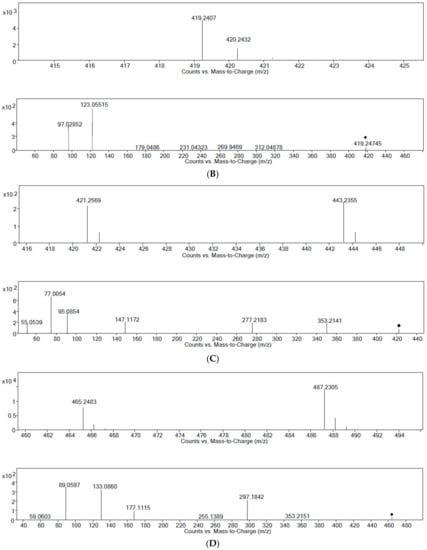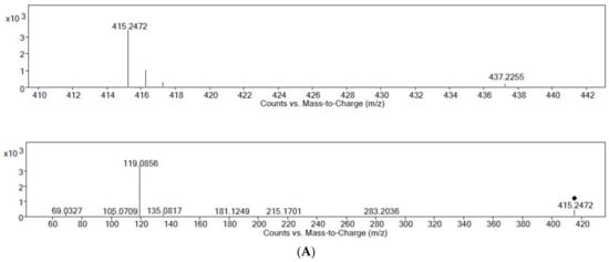 The parent compound of the erinacine A formula was C25H36O6. The MS spectrum of erinacine A was found at [M + H]+ = 433.2573 and [M + Na]+ = 455.2405 (Figure 3A). The MS/MS spectrum by the collision energy of 10 V is shown Figure 3B that correspond to the cleavage of the C-O ether bond ([C20H29O2]+ = 301.2162 and [C20H27O]+ = 283.2052) (Figure 3C) [15,32]. The Alcohols Dehydration metabolites (M1) formula was C25H34O5, with erinacine A losing an H2O [33,34]. The MS spectrum of M1 was found at [M + H]+ = 415.2472 and [M + Na]+ = 437.2255. At a collision energy of 10V, the main product ions were m/z 283.2036, 215.1701, 181.1249, 135.0817, 119.0856, 105.0709, and 69.0327 (Figure 4A). Two product ions were analogous to those of erinacine A ions (m/z 283.2036 and m/z 119.0856), and the product ion of m/z 301.2162 disappeared. Dehydrated M1 could be used to indicate water loss in pentose fragments [35]. The Demethylation metabolites (M2) formula was C24H34O6, with erinacine A losing a methylene (-CH2) [36]. At a collision energy of 40 V, the MS spectrum of M2 was found at [M + H]+ = 419.2407. The main product ions were m/z 312.0488, 269.9469, 231.0432, 123.0552, and 179.0486 (Figure 4B). The product ion at m/z 269.9469, 179.0486 corresponded to cleavage of the methylene (-CH3) and plus H+. The Demethylation + Hydrogenation metabolites (M3) formula was C24H36O6 with M2 reduction in alkene (+H2) [37,38,39]. The MS spectrum of M3 was found at [M + H]+ = 421.2569 and [M + Na]+ = 443.2355. At a collision energy of 40 V, the main product ions were m/z 353.2141, 277.2183, 147.1172, and 77.0054 (Figure 4C). The product ion at m/z 353.2141, 277.2183 were corresponding to Hydrogenation. The 2 × Hydroxylation metabolites (M4) formula was C25H36O8 with erinacine A Hydroxylation of isopropyl side chain and cyclopentene [40,41,42]. The MS spectrum of M4 was found at [M + H]+ = 465.2461 and [M + Na]+ = 487.2315. At collision energy of 20V, the main product ions were m/z 297.1842, 255.1389, 177.1115, 133.0860, and 89.0597 (Figure 4D). The product ion at m/z 297.1842, and 89.0598 were corresponding to Hydroxylation. The Demethylation and two Hydroxylation metabolites (M5) formula was C24H34O8 with M11 losing a methylene (-CH2). The MS spectrum of M5 was found at [M + H]+ = 451.2413 and [M + Na]+ = 473.2158. At collision energy of 40 V, the main product ions were m/z 321.1516, 178.1225, 101.0705, and 59.0601 (Figure 4E). The product ion at m/z 321.1516 corresponded to M4 cleavage of the methylene (-CH3) and plus H+.