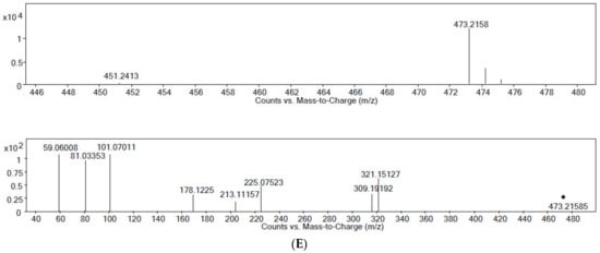 MS and MSMS spectrum of (A) Alcohols Dehydration (M1), (B) Demethylation metabolites (M2), (C) Demethylation + Hydrogenation metabolites (M3), (D) 2 × Hydroxylation metabolites (M4), (E) Demethylation and two Hydroxylations (M5) metabolite using an ultra-high performance liquid chromatography tandem quadrupole time-of-flight mass spectrometry. ◆: Parent ion.