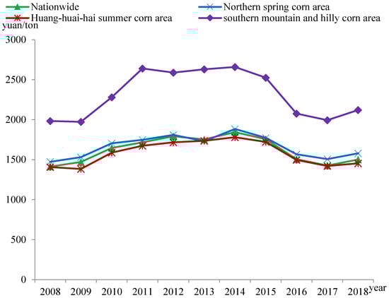 At present, the production cost of food and other agricultural products is primarily defined from the perspective of the economic and accounting cost in Western economics. In the most dependable Compilation of National Agricultural Product Costs and Benefits in China, the cost of agricultural products is largely concentrated in the field of production. However, research concerned with the circulation cost of agricultural products at the national level lacks necessary data support, making the transaction costs are difficult to measure. Therefore, in order to make complete use of the data at the national level, this paper follows relevant research results [33,34] and conducts quantitative analysis primarily from the perspective of accounting costs. The CPC is taken to be the total consumption of production factors per unit of corn output, including material and service costs, labor costs, and land costs. Figure 1 shows the CPC of the country and the three major corn producing areas for the period from 2008 to 2018.