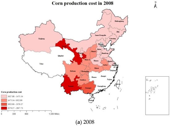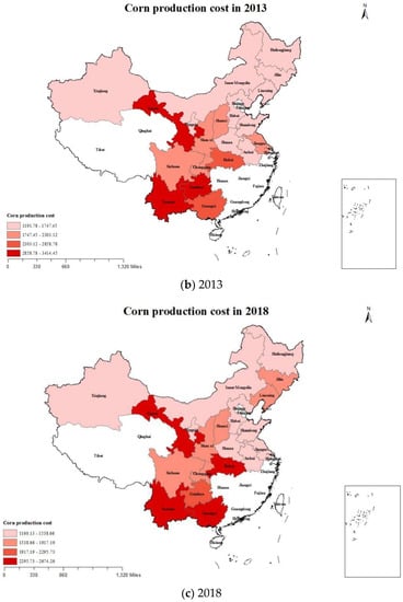 The development of grain production is interconnected not only with the economic benefit of Chinese farmers, but with the country’s grain security as well. In addition to opportunities, there have also been severe challenges in grain production after Chinese accession to the WTO. In 2018, Chinese grain stocks continued to rise as a result of the Chinese grain supply, while the demand gap was less than 45 million tons and Chinese grain imports exceeded 115 million tons [1]. The aforementioned situations constitute the strange phenomenon of the Chinese grain “three-quantity increase” [2]. The occurrence of this phenomenon may be attributed to the ceiling effect of Chinese agricultural product prices and the squeeze effect of rising cost floors [3]. China is both the second largest corn producer and consumer in the world, just after the United States. Corn production has continuously been exceeding rice output since 2012 and, thus, ranking first in Chinese grain output. In 2018, Chinese grain output was 658 million tons, of which corn made up 257 million tons, accounting for 39.09% of the total output [1]. From the above information, it may be concluded that corn occupies an important position in Chinese food security. In addition, it can also be concluded that the level of the CPC has a significant impact on the international competitiveness of Chinese corn. According to natural resource endowments and production conditions, the “Maize Advantage Regional Layout Plan” [4] divides Chinese corn planting areas into the northern spring corn area, the Huang-huai-hai summer corn area, and southern hilly corn area. The corn planting areas in the three major regions account for 47.74%, 37.67%, and 10.24% of the total planting area [1]. In these three regions, the CPCs are too high, while the benefits are too low [5]. In turn, this severely affects the international competitiveness of Chinese corn production. Therefore, studying the temporal and spatial differences and causes of the CPC has both theoretical and practical significance for improving the efficiency of corn production, extensively reducing the CPC in various regions of China, improving the international competitiveness of Chinese corn and increasing the incomes of grain farmers.