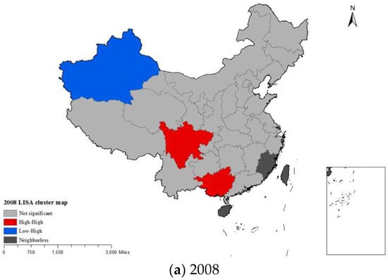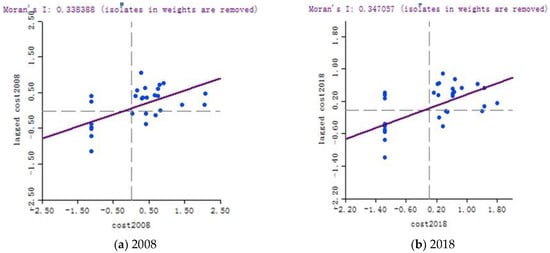 Global spatial autocorrelation is capable of describing the overall pattern differentiation characteristics among geographic attributes. Table 3 illustrates the global Moran’s I index and its corresponding Z and p values of the CPC in China’s 20 main producing provinces from 2008 to 2018. The results indicate that the global Moran’s I index is greater than zero and less than 0.5 during the period from 2008 to 2018. Additionally, the corresponding normal statistic Z value (Z-score) is greater than the critical value of the normal distribution function when the probability is 0.05 (1.96). All pass the significance test. The above mentioned shows that there is a positive autocorrelation relationship in China’s CPC, and similar values are clustered together. In other words, provinces with high production costs are spatially clustered, and provinces with low production costs tend to be adjacent. At the same time, the global Moran’s I index is around 0.4 during the period from 2008 to 2018, indicating that the spatial characteristics of China’s CPC are relatively stable. The aforementioned is the result of the CPC being closely related to natural factors, such as soil and climate. These factors show geographic similarities in China. In addition, by investigating the national and provincial water resources, the weather, and other related statistical data from 2008 to 2018, these data are found to fluctuate within the normal range. Overall, the agricultural production system has strong stability.