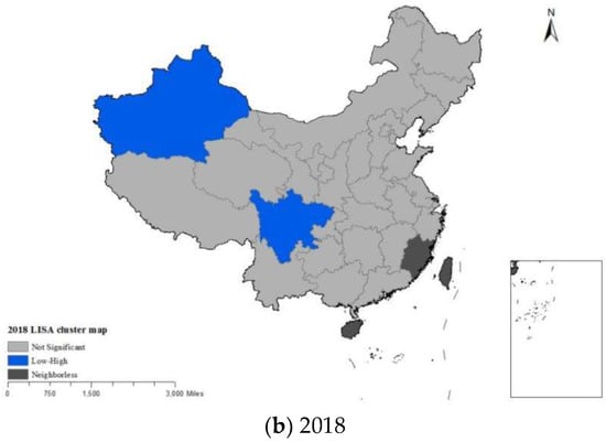 In order to further explore the aggregation characteristics of China’s CPC at the provincial level, this paper has conducted local spatial autocorrelation analyses and drawn local Moran’s I scatter plots and LISA cluster maps for 2008 and 2018. The scatter plots (Figure 3) indicate that the spatial agglomeration of the CPC has not significantly changed during the 11 years under examination. Furthermore, the LISA cluster diagram (Figure 4), shows that most of the main producing provinces’ CPC are spatially non-significant, while only a small part is significant. There are only “HH” agglomerations (red area) and “LH” agglomerations (blue area). All the areas exhibiting “H–H” clustering characteristics (red areas) are situated in the southern mountainous and hilly area, which is consistent with the actual situation. Additionally, for the period between 2008 and 2018, the number of “HH” clusters decreases by two, accounting for 10% of the total study areas. Conversely, the number of “LH” clusters increases by one, accounting for 5% of the total study areas. The number of provinces in each quadrant reveals little change. Overall, the local heterogeneity of the CPC has not changed significantly in the study period. This may be connected with the relative stability of the differences in natural and socio-economic conditions between the provinces.