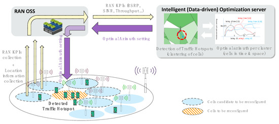 The cell network was analyzed with respect to its coverage and capacity needs and with respect to its traffic intensity in different areas. A set of cells was identified as the ‘candidate’ to be reconfigured in terms of their azimuth in order to cover these coverage and capacity needs. Measurements from these cells are collected in the form of radio access network (RAN) KPIs including RSRP, SINR, and throughput in software systems that are traditionally responsible for the operation and management of RANs, namely, RAN operations support systems (OSS). Location information is also collected either through the OSS or through third party geo-location systems. Algorithms responsible for parameter configuration and optimization then use these data in order to derive parameter settings (e.g., azimuth angles). These algorithms are typically hosted in an intelligent (data-driven) optimization server, as depicted in Figure 2, which can be either a sub-part of a RAN OSS or a separate software application. The derived azimuth settings are then applied to the selected cell(s) and the newly produced KPIs are expected to increase. The above should be a continuous and (as much as possible) automated process to ensure that the network always operates with the optimal parameters in all different contexts (i.e., time and space variations).