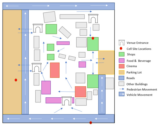 The mobility model of the simulation [22,27] was parametrized with a set of areas of interest (shops, restaurants, parking lots, cinemas etc.) that are relevant to shopping malls Figure 3. Each area was linked with predefined paths according to the actual topology of the underlying area for added realism. The areas of interest were split into various categories characterized by mobility information and traffic usage levels. Areas that generate notable mobile user hot-zones are recreation areas (high mobile usage and high dwell time), which are typically coffee shops, restaurants, etc. and offline areas where high density and high dwell time was observed but mobile phone usage was limited (e.g., parking lots and cinemas).