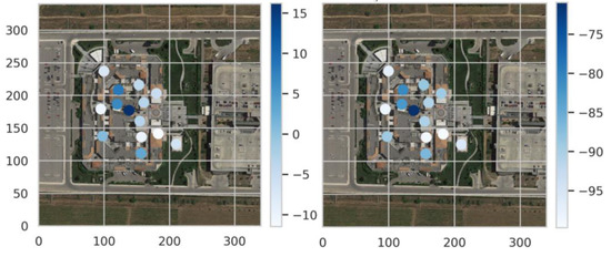 The hybrid network–spatial clustering’s goal is to simultaneously detect clusters with deteriorated radio quality and signal strength as well as identify their exact location using the location centroid components. Based on this, we expect it to produce the best possible azimuth steering actions that will maximize the effectiveness of the gNB’s antennas. The results of the algorithm execution are shown in Figure 6. They include both location and clear indication of the network metrics for each centroid. Using this information, the algorithm filters the centers into a smaller set that only includes actual traffic hot-zones.
