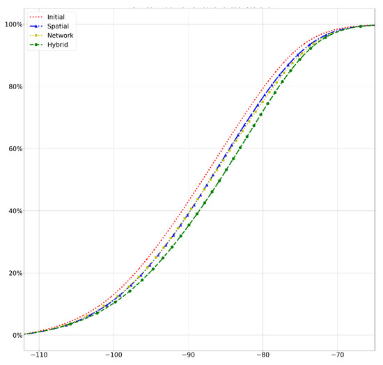 Performance evaluation of each algorithm performance vs. the initial scenario for RSRP (dBm) CDF.