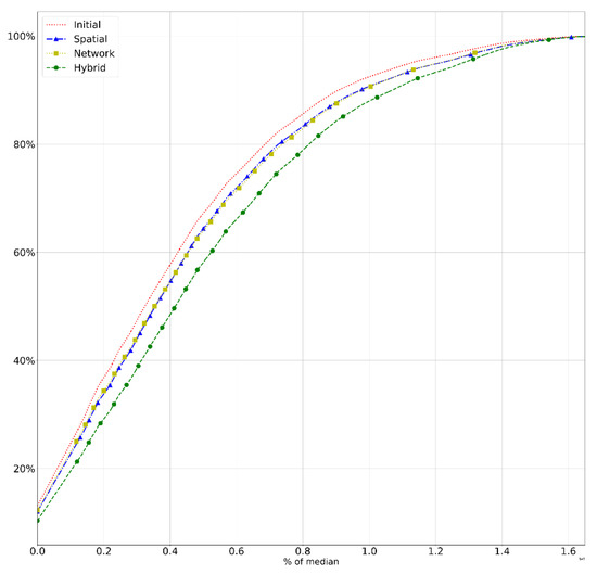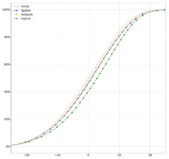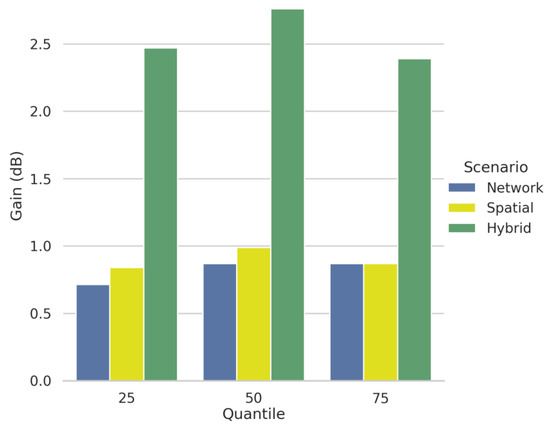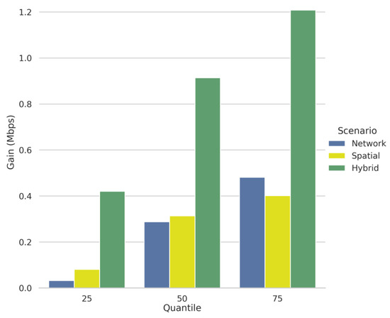 To summarize the comparison between the algorithms, we computed the distribution percentiles of the data generated by all the different reconfiguration schemes for all evaluation KPIs, RSRP gains Figure 10, SINR gains Figure 11, and normalized per user downlink throughput Figure 12. The proposed scheme–hybrid network spatial clustering outperformed the baseline algorithms for this type of environment by a factor of more than ~100% in most cases. Another notable result was that the spatial and network algorithms, although they performed completely different reconfiguration actions, showcased very close performance and both their overall statistical distribution as well as the percentiles improved the network performance to a similar degree.
