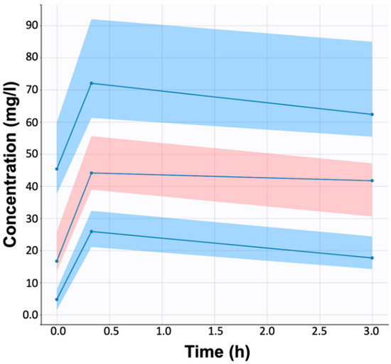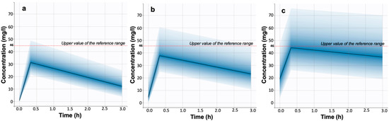 To determine the effects of renal function (expressed by the significant covariate CKD-EPI eGFR) on levetiracetam levels, simulations were performed based on the developed pharmacokinetic model. The utilized model parameters were those listed in Table 2, while two physiological/pathological situations were further simulated: Subjects with normal renal function [23] and subjects with 50% clearance restriction. It can be seen from Figure 4 that increased levetiracetam concentrations are observed with increasing renal function impairment. In healthy subjects, the mean maximum concentration was 31.1 mg/L (Figure 4a), which increased to 37.67 mg/L and 44.12 mg/L in patients with a 50% reduction in eGFR (Figure 4b) and patients with identical physiological characteristics to those in the study (Figure 4c), respectively. This means that the dosing regimens administered resulted in concentrations above the upper value of the reference range of 12–46 mg/L in almost half of the study patients [14].