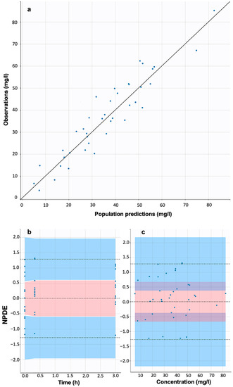 Figure 1 shows the graphical evaluation of the final model. The visual representation of the predictive power shows that the prediction interval of the developed model includes the experimental concentration data in all cases. Similarly, the good predictive ability of the model is also illustrated in Figure 2, where the population predicted versus observed concentration values are almost linearly correlated (Figure 2a) and the NPDE versus time (Figure 2b) and concentration (Figure 2c) plots show an adequate performance. Additional goodness-of-fit plots are shown in the supplementary material (Figure S1a–c).