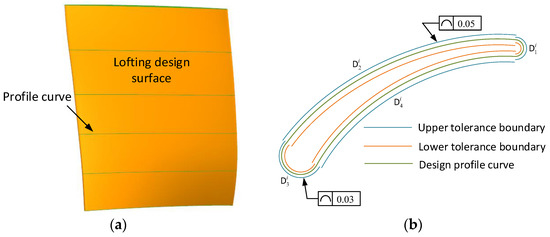 (a) The design surface is constructed based on profile curves by the lofting method; (b) different tolerance bands on different segments of the profile curve.