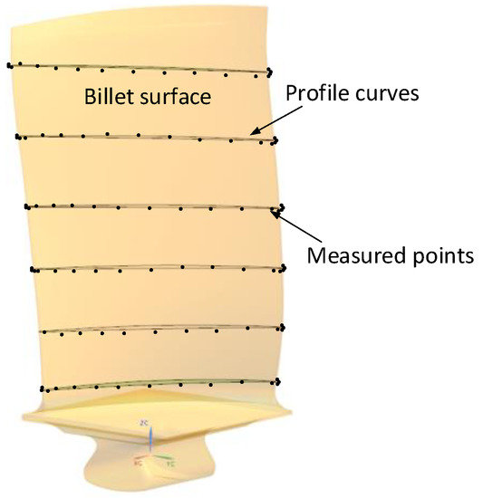 The blade billet shape is used to judge the material allowance for the to-be-cut blade surface. The blade billet shape is always recognized by on-machine measurement. The to-be-measured points are planned on the designed blade profiles. The measured result represents the real material boundary on the profile curves section (Figure 2). They are represented by .
