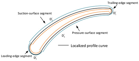 where represent the closest points on the suction segment and the pressure segment of the profile curves, represent the closest points on the leading-edge segment and the trailing-edge segment of the profile curves. and are the scatter points on the tolerance boundaries. and are the unit normal of the scatter point. is the index of the profile curves and are the index of the scatter points on the profile curve.