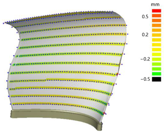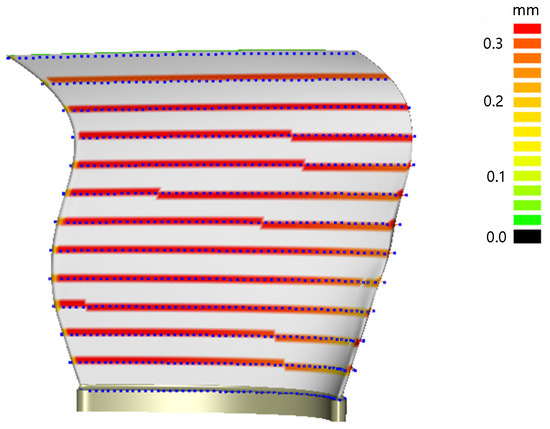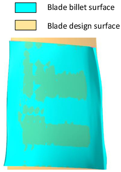 The optimized to-be-cut blade surfaces after optimization are shown in Figure 9. The chart color represents the material allowance left on the optimized to-be-cut blade surface. In the case of the unconstrained optimization, the profile curves were adjusted to put the to-be-cut blade surface in the middle of the blade billet (Figure 9). However, there was not enough material because this was be ensured in the optimization model. In the case of material-constraint optimization, there was sufficient material for subsequent machining (Figure 10). There was enough material because of the material constraint in the optimization model. In the case of the multi-constraint optimization, the material allowance was satisfied for subsequent machining (Figure 11). This achieved the same effect as the previous optimization method.