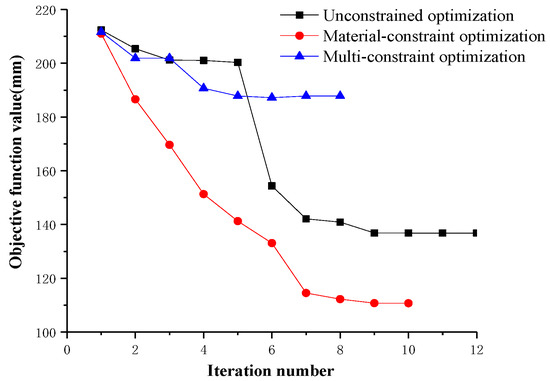 Figure 7 demonstrates that there was an absence of material allowance in some areas of the design blade model. If the design blade model was used directly to generate the toolpath, the machining would fail. Thus, it was necessary to implement the localization before the subsequent machining. The above three optimizations of localization were implemented. The convergence rates of the three optimizations are shown in Figure 8. In the unconstrained optimization, the square sum of the unsigned distances that only let the to-be-cut blade surface be in the center of the blade billet was minimized. In the material-constraint optimization, the square sum of the signed distances with all positive distances was minimized. In the multi-constraint optimization, the objective function was achieved with fewest iterations.