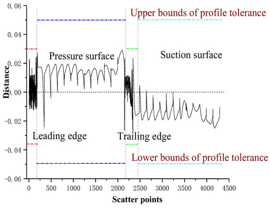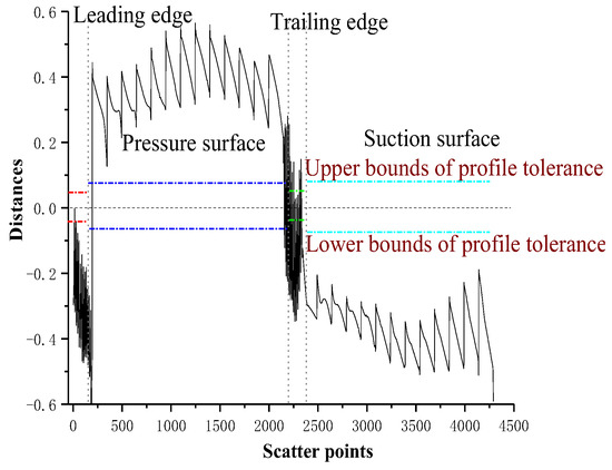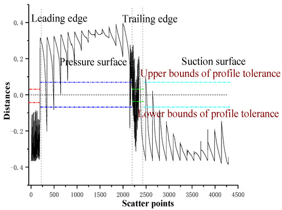 The distances between the optimized profile curves and the design profile curves for the unconstrained optimization are plotted in Figure 12. It can be observed that the profile curves were outside the profile tolerance. That is to say, the to-be-cut blade surface was not a qualified surface for generating a toolpath. Figure 13 shows the distances between the optimized profile curves and the design profile curves for the material-constraint optimization. Similarly, the to-be-cut blade surface is not a qualified surface due to the off-tolerance profile curves. The distances between the optimized profile curves and the design profile curves are plotted in Figure 14 for the multi-constraint optimization. In contrast to the results of the other two methods, they are within the profile tolerances. Thus, the to-be-cut blade surface reconstructed by the optimized profile curves is qualified.