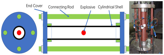 The dynamic deformation and crushing characteristics of metal cylindrical shells under an internal explosive load are of great theoretical significance and practical value. In the military field, the mechanical response and endpoint effect of the cylindrical shell structure under the explosive load are always the focus of attention [1,2]. In the field of public security, to effectively limit the scope of explosion shock waves and detonation products, an explosion-proof container can be used to deal with suspected explosive objects [3,4]. In the petrochemical field, pressure vessels often operate under high temperature and high pressure. In the event of sudden failure, the internal inflammable and explosive medium may explode [5,6].