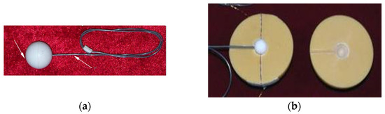 Two kinds of explosives were used in the experiment. One is a spherical explosive detonated at the center, which had a less than 30 g TNT equivalent and is pressed with micron Penta erythrite Tetranitrate (PETN) powder, as shown in Figure 2a. It is used for initiation by a soft lead skin blasting cable with a diameter of 1 mm and a linear charge density of 0.5 gRXD/m. The white crystal PETN is a simple explosive, with a melting point of 141.3 °C, crystal density of 1.77 g/cm3, explosive velocity of 8300 m/s, and explosive heat of 5895 kJ/kg. In addition, it is not hygroscopic, and is insoluble in water but dissolves easily in acetone. The explosive of more than 30 g TNT equivalent is composed of two main hemispheric explosives and a small explosive ball for detonating in the center, as shown in Figure 2b. The white ball with a diameter of 10 mm is a detonating ball (PETN) with 1 gTNT equivalent, and the main explosive composition of Hexogen/Trinitrotoluene (RDX/TNT:60/40) has an equivalent ratio of 1.25 and a density of 1.65 g/cm3.