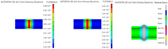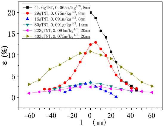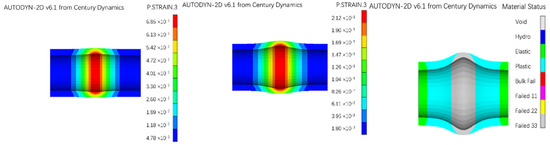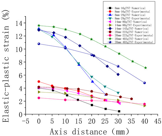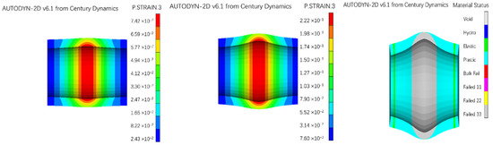 Figure 6, Figure 7 and Figure 8 show the circumferential strain cloud diagrams of 8 mm, 14 mm, and 20 mm-thick cylindrical shells under different charges by numerical simulation, while the numerical calculation results were compared with the experimental results, as shown in Figure 9.