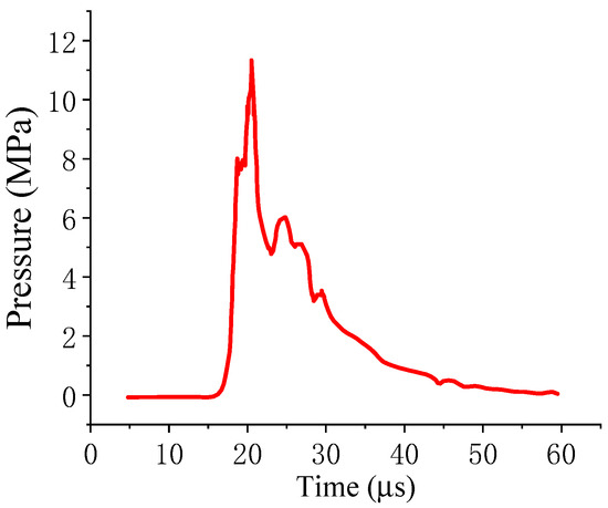 The calculation results of the dynamic response of the cylindrical shell under loading of 41.6 g TNT explosive shock wave are analyzed as an example. Figure 10 shows the pressure time−history curve of the explosive shock wave loaded onto the inner surface of the cylindrical shell directly opposite to the explosion core. It can be seen from the curve that the explosive shock wave formed by the TNT explosion is loaded onto the inner surface of the cylindrical shell after propagating for a period of time (about 11 μs in front of the pressure curve of the shock wave loaded on the inner surface of the cylindrical shell). The shock wave pressure rises rapidly on the inner surface of the shell, and the peak pressure on the blast core reaches 1000 MPa. Under the action of high intensity shock wave pressure, the shell rapidly deforms in the radial direction. According to the principle of explosion mechanics, the load intensity of the blast wave decreases with the increase of the distance from the explosion center. Therefore, the point on the inner surface of the cylindrical shell with a larger distance from the explosion center section will bear a smaller load of the blast wave, resulting in overall deformation of the cylindrical shell that is radially bulging.