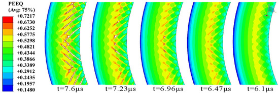 The explosive loading of the destruction process of 20# steel-made cylindrical shell is shown in Figure 11. It can be seen that along with the column shell expansion process, the plastic damage zone is first formed within the shell, and then the crack produced by the shell wall of the damage area extends outward along the direction of the shear surface, and finally forms the internal initial shear failure along the shear direction.