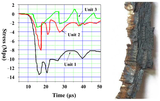 The numerical simulation results of the 8-mm-thick steel shell of under 16 g TNT are analyzed. The steel shell is divided into three thickness units along the radial direction (Units 1, 2, and 3), with positions of 0 mm, 4 mm, and 8 mm. Unit 1 is the inside surface of shell, Unit 2 the middle section, and Unit 3 the outer side of the shell. It obtains the time history law of the radial stress, hoop stress, and axial stress of three points. Figure 12 shows the time history curves of radial stress of three point and experimental fracture. The shell is in the state of compressive stress in radial, hoop, and axial directions at the initial stage of the explosion shock wave loading and unloading (about the time period of 12–25 μs), but the compressive stress and response time decrease gradually in the radial, hoop, and axial directions from the inside to the outer surface. The Unit 3 point of the shell changed to a tensile stress state after a short-time hoop compressive stress. There are two reasons for this: One is the high strength and short time of the radial loading of the shell by the blast shock wave, which causes an extremely high hydrostatic stress for a short period of time (2–3 μs). The other is the high speed of the radial propagation of the stress wave in the shell, which results in the time of less than 2 μs for the stress wave passing through the whole shell, as well as a period of about 90 μs for the radial expansion vibration of the shell. Therefore, the one-quarter period of the structure response is much larger than the time of the stress wave passing through the whole shell wall. In the initial stage of radial deformation (about 15–25 μs for the blast loading), the radial, hoop, and axial stresses are compressive stress in a certain range near the inside surface, while the shell is in the tensile stress state in a certain range near the outer surface. With the increase of the radial deformation of the shell, the pressure of the explosion shock wave is gradually unloaded, the stress wave inside the shell is gradually reduced, and the axial and hoop stress state of the shell is gradually changed from the compressive stress state to the tensile stress state within a certain range of the inner surface. However, the tensile stress on the outer surface of the shell is greater than that on the inner surface for a considerable period of time (about 100 μs). The results show that the internal stress state of the shell is controlled by the high-intensity explosive shock wave load and the radial deformation of the shell. This is a remarkable difference from the normal axisymmetric static stress state. In addition, the axial tensile stress is smaller than the hoop tensile stress in the local radial deformation process of the shell.