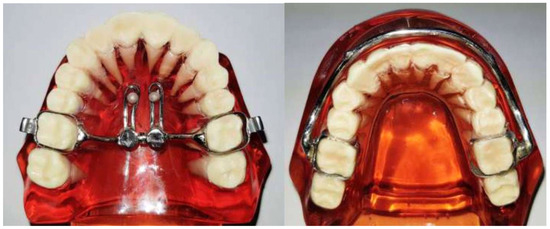 In the upper jaw, two palatal arms made from 2 mm stainless-steel wire were soldered to the expansion mini-screw, as well as two 1.2 mm stainless-steel wire teardrop loops that are used for insertion of two anterior mini implants at the level of the first premolar connecting it to the upper appliance.
