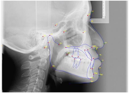 The cephalometric X-ray was taken using lateral cephalometric machine Gendex Orthoralix, Italy, at initial observation (T1) before the start of treatment and (T2) at the end of active treatment. Cephalometric tracing was performed using Planmeca Romexis Software, which is considered a reliable tool for lateral cephalometric measurements [14] and analyzed by a single operator. Tracing and measurements were performed on pre- and post-treatment cephalograms to measure the efficacy of treatment (skeletal, dental, and soft tissue changes) as shown in Figure 4 according to variables in Table 1 [15].