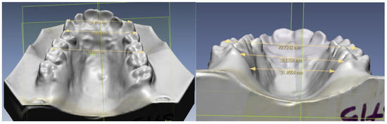 This step was performed using a 3D laser scanner (Next Engine Inc., Model 2020i, Santa Monica, CA, USA) for pre-and post-dental models. Dental casts of the subjects were obtained from alginate impressions before expansion (D1), before start of treatment and after expansion (D2), at the end of treatment. After image acquisition (Figure 5), the landmarks (Table 2) [16] are digitized, and the transverse measurements were recorded. The variables used per identification and measurements were inter-canine widths (ICW), inter-1st premolar widths (IPW), inter-first molar widths (IMW), and palatal width (PW).