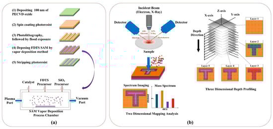 Self-assembled monolayer (SAM) based micro and nanostructures could be ideal devices to evaluate advanced semiconductor fabrication and characterization equipment for the AES and XPS techniques. A SAM film is a highly ordered molecular assembly formed by a spontaneous chemical reaction between a SAM precursor and the solid surface underneath [20,21]. The SAM precursor is composed of three components: a head group, a carbon chain skeleton, and a tail group. The head group and a tail group can be tailor-designed for specific applications, which makes SAM materials an excellent ecosystem for micro/nano surface property modification. During the chemical reaction between the tail group and the solid surface underneath, the monolayer will spontaneously pack into a highly ordered film due to the van der Waals forces between the carbon chain skeleton of the SAM precursor. Similarly to the head groups, the tail group also can be selected among various chemical groups catering to the specific solid surface underneath, including a thiol group (-SH) on a gold surface [22,23] or trichlorosilanes (-SiCl3) and trimethoxysilanes (-Si (OCH3)3) on an oxide surface [24]. In particular, trichlorosilanes are intensively investigated in semiconductor-related applications to modify a dielectric layer’s surface properties, including those of silicon oxide, aluminum oxide, and ITO [24,25,26]. There are two categories of techniques to fabricate SAM films; liquid-based methods are one, and vapor-based methods are the other. For liquid-based methods, high-quality SAM films from trichlorosilane precursors are laborious to make because the amount of water in the SAM precursor solution needs to be meticulously controlled [19,20]. Absent or low amounts of water in the SAM precursor solution will result in incomplete SAM film formation. On the contrary, too much water will lead to facile polymerization of the SAM precursor in solution and unwanted polysiloxane deposition on the solid surface underneath. Typically, there are many defects in the SAM films obtained from the liquid-based methods [21,22]. Therefore, several vapor-based methods have been developed to make SAM films in an ambient environment or in a vacuum chamber [23,24,25]. For instance, the hexa-methyl-disilazane (HMDS) layer obtained in a vacuum chamber—a regular process in a high-end semiconductor facility—has the smallest number of surface defects. For the vapor-based deposition method, the liquid formed SAM precursor and catalyst will be vaporized due to the low vacuum condition and be transferred to a vacuum chamber at a specific temperature. The amount of HMDS precursor vapor will be precisely controlled by a flow meter. With no contaminants from the ambient environment and precise reaction process control, a high-quality HMDS SAM film can be obtained with fewer physical defects and higher uniformity. To be qualified as a calibration sample for the AES and XPS techniques, highly uniform SAM-based micro/nanostructures with fewer physical defects must be fabricated.