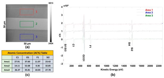 To obtain Auger spectra information about the FDTS SAM film pattern, a high spatial resolution secondary electron SEM image of an area 50 µm by 50 µm was taken as shown in Figure 2a. Three areas on the silicon wafer were selected: two dark areas, Area1 (red rectangle) and Area3 (blue rectangle) within the FDTS SAM film pattern, and one light area, Areas2 (green rectangle) within the silicon dioxide pattern. As shown in Figure 2b, the four elements C, O, Si, and F were selected to perform Auger electron detection. In the two dark areas, conspicuous fluorine KLL Auger electrons (F1) were detected at 648 eV. For oxygen elements, O1 and O2 KLL Auger electrons were detected at 479 eV and 502 eV. For carbon element, C1 KLL Auger electrons were detected at 271 eV. For silicon elements, Si1, Si2, Si3, and Si4 KLL Auger electrons were detected at 59 eV, 1501 eV, 72 eV, and 1602 eV, respectively. We selected C1, O1, F1, and Si2 as the typical element states to characterize the FDTS SAM patterns. As shown in Figure 2c about atomic concentration (AC%) of the four elements, concentrations of fluorine KLL Auger electrons on Area1 (11.07%) and Area3 (10.03%), containing FDTS SAM patterns, were much higher than that of the fluorine KLL Auger electrons (0.36%) on Area2 containing silicon dioxide patterns. As for carbon element, concentrations of carbon KLL Auger electrons on Area1 (27.91%) and Area3 (26.37%), containing FDTS SAM patterns, were higher than that of the carbon KLL Auger electrons (14.11%) on Area2 containing silicon dioxide patterns. As for oxygen element, concentrations of oxygen KLL Auger electrons on Area1 (37.60%) and Area3 (35.81%), containing FDTS SAM patterns, were lower than that of the oxygen KLL Auger electrons (52.68%) on Area2 containing silicon dioxide patterns. As for silicon elements, concentrations of silicon KLL Auger electrons on Area1 (23.42%) and Area3 (27.78%), containing FDTS SAM patterns, were lower than that of the silicon KLL Auger electrons (32.85%) on Area2 containing silicon dioxide patterns.