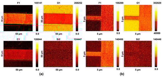 Reconstructed mapping image of KLL Auger electrons in two areas, fluorine Auger electrons, F1, oxygen Auger electrons, O1, carbon Auger electrons, C1, silicon Auger electrons, Si2. (a) The same area is shown in Figure 3a. (b) The area with a line width of 10 µm.