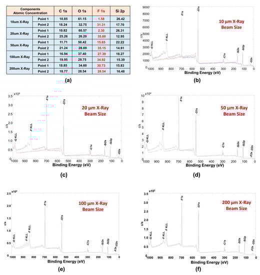 (a) Atomic concentration (AC%) of four chemical states (C 1s, O 1s, F 1s, and Si 2p) when the X-ray beam size changed from 10 µm to 200 µm. X-ray photoelectron spectroscopy (XPS) spectra of Point 1 and Point 2 with the X-ray beam changed from 10 µm to 200 µm: (b) 10 µm, (c) 20 µm, (d) 50 µm, (e) 100 µm, and (f) 200 µm.