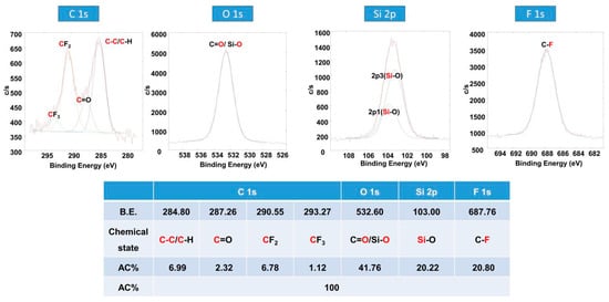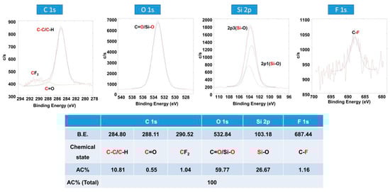 X-ray photoelectron spectroscopy (XPS) spectra with high resolution of four chemical states in Point 2: C 1s, O 1s, Si 2p, F 1s, and atomic concentration (AC%) of four chemical states in one sampling area.