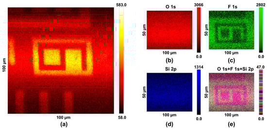 (a) Induced secondary electron image (SXI) of an area of 50 µm by 50 µm. Reconstructed mapping image of chemical states within the same area shown in (a). (b) O 1s, (c) F 1s, (d) Si 2p, and (e) O 1s+F 1s+Si 2p.