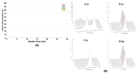 (a) Etching curve of four chemical states (C 1s, F 1s, O 1s, and Si 2p) using oxygen gas cluster ion beam (GCIB). (b) XPS 3D profiling with a gas cluster ion beam (GCIB), alternating with XPS detection (one layer etching, one layer XPS).
