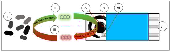 Schematic of LAB detection concept: the LAB (i) reduces a redox mediator (ii) that is released from a specific detection substrate, in this case resorufin-β-d-galactopyranoside (not shown), which is subsequently oxidized (iii) at the working electrode (iv) of a screen-printed electrode 4 mm in diameter printed with carbon ink. The counter electrode (v) is also carbon ink, and the reference electrode (vi) is silver. All are connected to the potentiostat by a USB connection (vii). Once oxidized, the mediator can be reduced again by the microbe in a cyclical fashion.