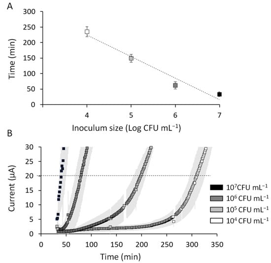 (A) Calibration curve for E. faecalis detection showing detection time (minutes) with inoculum size as log CFU mL−1 (r2 = 0.96). (B) Chronoamperometry curves of corresponding inoculum sizes and from which calibration curve is derived. The dotted line corresponds to the thresholdof detection.. Mean values are shown, error bars correspond to the standard deviation of three replicates and are represented by bars (A) or by the shaded area (B).