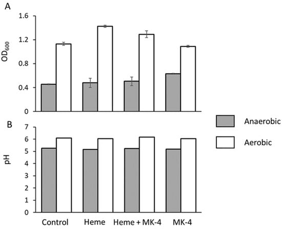 Upon analyzing the growth yields of E. faecalis in bench top experiments, we observed that the optical density (OD600) was always higher in aerobic conditions than it was in anaerobic ones (Figure 3A). This phenomenon was reported previously [26] and it is suggestive of respiratory behavior and could arise from residual heme or quinoids in the undefined medium that we used as was reported for the Todd Hewitt broth r by Del Papa and Perego (2008). Further analysis shows that the addition of heme, menaquinone, or both does not alter this trend, although menaquinone does give a slight boost in growth, observed by an increase in OD in anaerobic conditions, suggesting a role in managing reactive oxygen species (Figure 2A). A comparative analysis of Lactobacilli electron transport chain stimulation by heme and menaquinone by Brooijman et al. (2009) [25] showed similar behavior in E. faecalis, i.e., that E. faecalis growth is stimulated by menaquinone and, to greater extent, by the addition of both heme and menaquinone. However, the difference in pH between ‘fermentative’ and ‘respiratory’ growth ranged only between 0.2 pH units (5.62–5.82) [25], although growth increased by 38%. Under equivalent conditions, we observed a quantitatively lower increase in growth (OD600) of around 14% and the pH to be similarly stable (Figure 3B). We observed a pH with a delta (ΔpH) of only 0.13 pH units but an overall moderately lower pH of 5.14 and 5.27 between the unsupplemented control and supplemented conditions, respectively. The ΔpH between fermentative LAB and the supplemented treatment thathad been induced to respire was previously reported to be greater what we have observed here, and the observed ΔpH is usually close to a single pH unit; for example, the ΔpH between a heme and menaquinone-stimulated Streptococcus entericus culture compared to an unsupplemented control was 1.07, with the final pH being 4.42 and 5.49 for fermentative and respiratory conditions, respectively [25]. Taken together, although E. faecalis exhibits less respiratory stimulation upon the addition of heme in BHI medium relative to other LAB, it is clear that it does derive some growth benefits from medium supplementation with respiratory components. Despite the small difference in pH between respiratory and fermentative growth in E. faecalis, Broojiman (2009) still concluded that E. faecalis is both heme and menaquinone stimulated [25].
