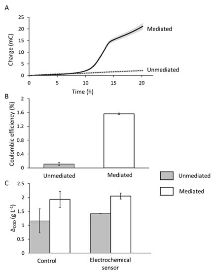 (A) Mean charge and (B) mean coulombic efficiency of E. faecalis in systems grown in electrochemical conditions. (C) Comparison of COD consumption by E. faecalis in benchtop incubations and electrochemical conditions. The shaded area in (A) and the error bars in (B,C) represent the absolute error of duplicate measurements.