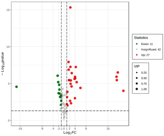VIP (variable importance for projection) plot of differential metabolites in TH vs. TL blooming flowers. Red dots were metabolites accumulated more in TH, and green dots were metabolites accumulated more in TL.
