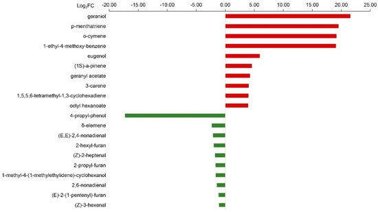 Differential metabolites were defined as those with a FC (fold change) ≥2 or ≤0.5, with variable importance for projection (VIP) value > 1 and p value < 0.05. In total, 38 differential metabolites (DMs) were identified from 80 volatile components between two different aromatic varieties of D. loddigesii (Table S2). Among the DMs, 27 were up-regulated and 11 were down-regulated in the TH relative to TL, the trend in the changing of DMs was consistent with the intensity of the floral scent between two aromatic D. loddigesii. Compared with TL, geraniol (log2FC = 21.58) and 4-propyl-phenol (log2FC = −17.29) were the most significant DMs in TH (Figure 3). 3-Carene (11.87%) of TH showed the highest relative content, which was followed by acetic acid octyl ester (9.65%), 1-octanol (8.45%), β-ionone (4.32%), geranyl acetate (3.92%), octyl isobutyrate (2.93%), hexyl benzoate (2.90%), eugenol (2.51%), epoxy-β-ionone (1.95%), p-mentha-1,5,8-triene (1.50%), and geraniol (0.97%). The total relative contents for all of the ten aforementioned DMs in TH was 52.63%. 2-Pentyl-furan (4.28%), acetic acid octyl ester (3.81%), (E,E)-2,4-nonadienal (3.36%), β-ionone (2.26%), 1-octanol (2.19%), 2-propyl-furan (1.77%), (Z)-2-heptenal (1.76%), 1-methyl-4-(1-methylethylidene)-cyclohexanol (1.74%), and epoxy-β-ionone (1.24%) were the top 10 DMs expressed in TL; their total relative content was 22.41%.