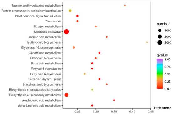 In total, 24,570 DEGs were classified into 57 GO terms; there are 28, 18, and 11 terms in the three major categories, respectively. Among them, the terms ‘cellular process’ and ‘cell’ are dominant in the biological process and cellular component categories, respectively, while ‘binding’ is dominant in the category of molecular function (Figure S3). To further understand the function of DEGs in biological processes, 140 KEGG pathways showed hits with DEGs, of which 36 pathways were significantly enriched with DEGs. The top-20 enriched pathways were visualized on a dot bubble. The ‘metabolic pathways’ (ko01100) and ‘biosynthesis of secondary metabolites’ (ko01110) pathway were the top 2 remarkably enriched KEGG pathways (Figure 5).