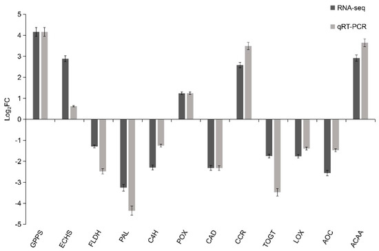 A comparison of differential expressed genes related to floral scent in flowers by RNA-seq and real-time PCR. Limonene and pinene degradation: ECHS, enoyl-CoA hydratase. Terpenoid backbone biosynthesis: GPPS, geranyl diphosphate synthase; FLDH, NAD+-dependent farnesol dehydrogenase. Phenylpropanoid biosynthesis: PAL, phenylalanine ammonia-lyase; C4H, cinnamate 4-monooxygenase; POX, peroxidase; CAD, cinnamyl-alcohol dehydrogenase; CCR, cinnamoyl-CoA reductase; TOGT, scopoletin glucosyltransferase. alpha-Linolenic acid metabolism: LOX, lipoxygenase; AOC, allene oxide cyclase; ACAA, acetyl-CoA acyltransferase.