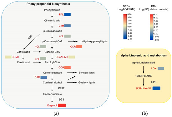 Change fold of DEGs and DMs in TH compared to TL. (a) Phenylpropanoid biosynthesis: 4CL, 4-coumaroyl-CoA ligase; C3H, p-coumarate-3-hydroxylase; COMT, caffeic acid O-methyltransferase; CCoAOMT, caffeoyl-CoA O-methyltransferase; CFAT, coniferyl alcohol acetatyltransferase; EGS, eugenol synthase; (b) alpha-Linolenic acid metabolism: HPL, hydroperoxide lyase; 13(S)HpOTrE, (9Z,11E,15Z)-(13S)-Hydroperoxyoctadeca-9,11,15-trienoate. Other abbreviations were as shown in Figure 4. Red represented the mapped DEGs and DMs. Dotted arrow represented unknown steps; double arrows represented multiple steps.